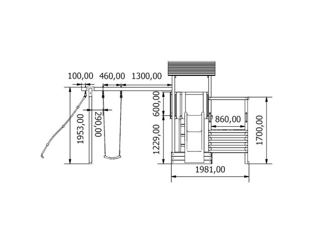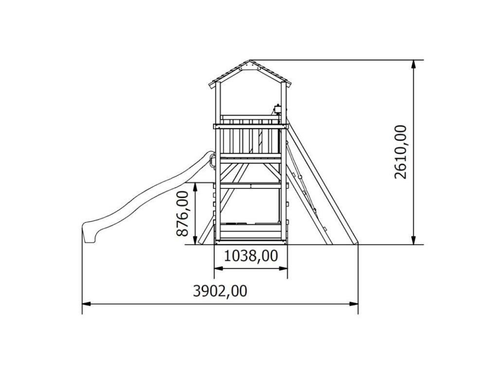 | Dřevina: borovice Povrch: tlaková impregnace Rozměry v/š/hl: 2610 x 4272 x 3902 mm Hmotnost: 150 kg Nosný sloupek věže: 68 x 68 mm Skluzavka ve výšce: 1200 mm Výška zábradlí: 600 mm Podstavec věže: 1000 x 1000 mm Nosník houpačky: 90 x 90 mm Sloupek A-kons: |