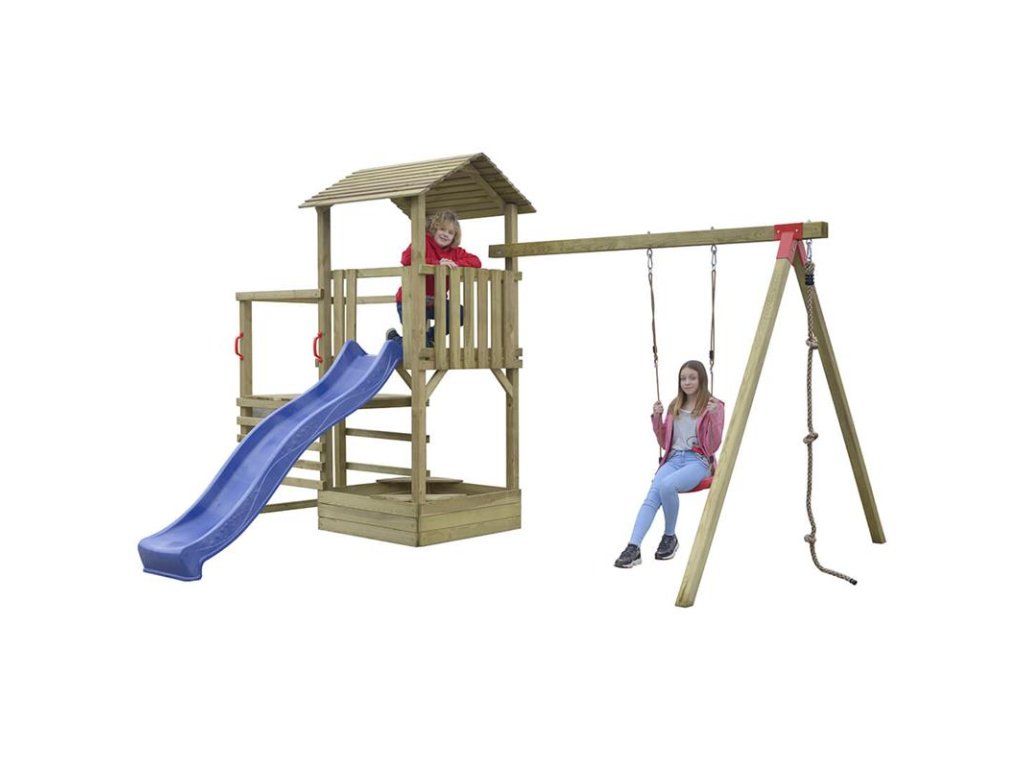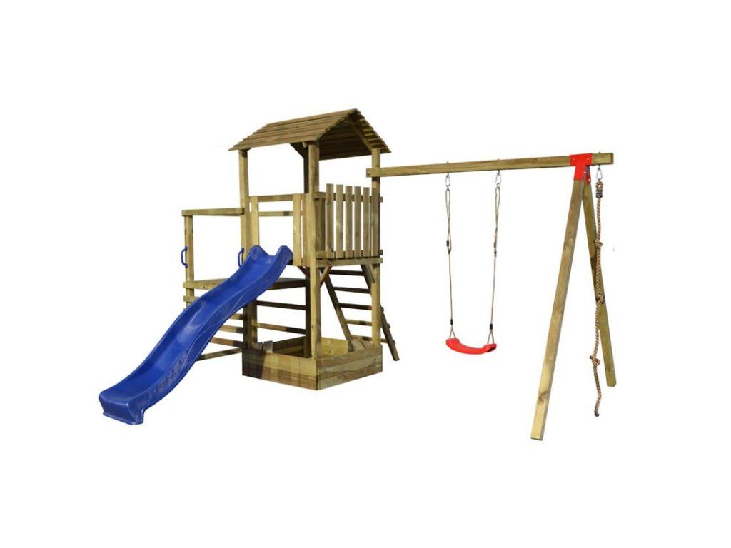 Tuto multifukční dětskou hrací věž si Vaše děti určitě zamilují. Na hlavní věž s dřevěnou stříškou děti vylezou pomocí žebříku a dolů se pak dostanou sklouznutím po krásné skluzavce. Další zábavu si pak užijí na houpačce, můžou si zašplhat na laně nebo si hrát na pískovišti. Jednoduše ideální zábava pro každé dítě. Montáž žebříku je variabilní, je možné ho namontovat ze dvou stran.