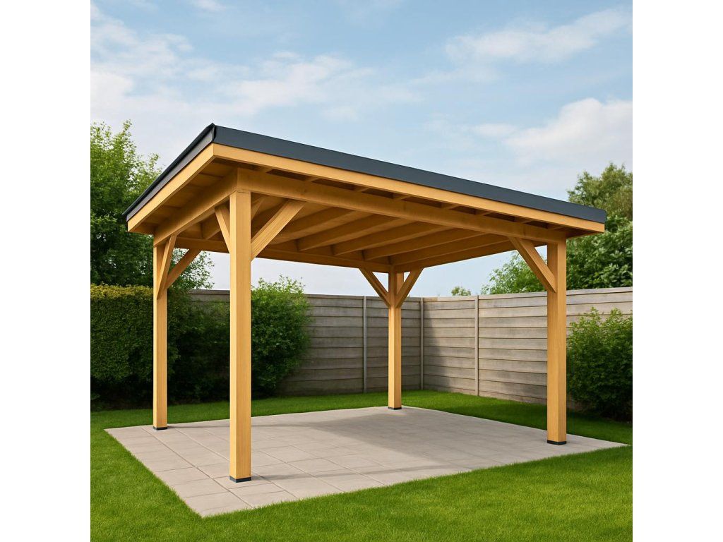 Pultová pergola Benedikt 3×3 m je samostatně stojící dřevěná konstrukce s moderní pultovou střechou, vhodná pro zastřešení terasy, posezení nebo prostoru u domu.