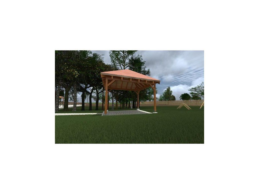 Všechny dřevěné prvky jsou z naformátovaného sušeného smrkového hoblovaného dřeva, sloupy 120/120 mm, pozednice 120/200 mm, krokve 80/140 mm. Konstrukce je navržena pro zastřešení lehkou střešní krytinou.